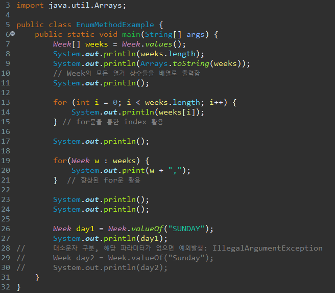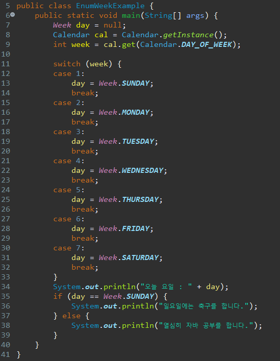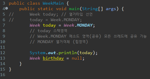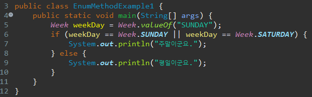 다음으로 열거 타입 Week 객체를 새로운 클래스의 메인메소드에서 호출하여 활용하는 코드이다.