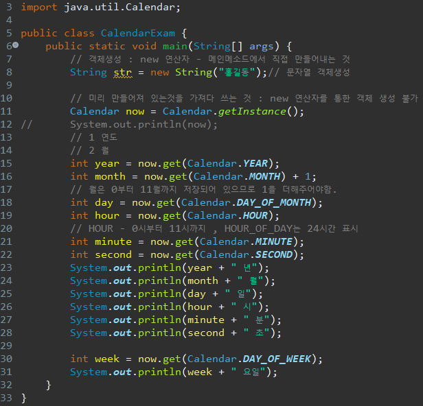 일반적으로 메인메소드에서 객체를 생성할 때에는 new 연산자를 사용하여 객체를 생성하지만 날짜와 시간을 확인할 수 있는 클래스 Calendar는 미리 만들어져 있는 열거타입 객체이기 때문에 new 생성자를 통한 객체 생성이 불가하고, 대신 Caelndar.getInstance() 메소드를 활용해 가져다 쓸 수 있다. Calendar 객체에 열거된 상수를 now 객체에서 참조하여 오늘 날짜와 시간을 출력해보았다.