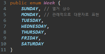 그리고 열거 상수는 관례적으로 모두 대문자로 표현한다.