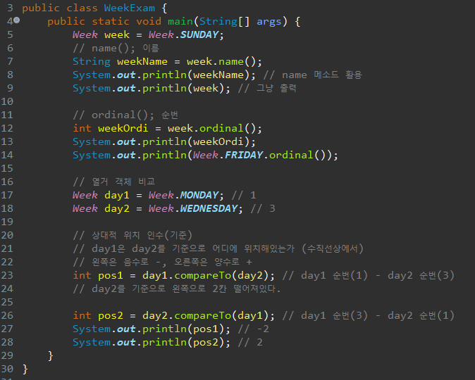 또한 compareTo()는 열거 객체를 비교해주는 역할을 하는데, "변수1.compareTo(변수2)"로 할당해주면