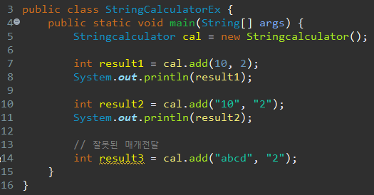 그런데 StringcalculatorEx 클래스의 Line 4와 같이 숫자로 변환할 수 없는 String 타입의 파라미터를 전달받았을 때