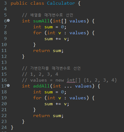 배열을 매개변수로 갖는 메소드와 가변인자를 매개변수로 갖는 메소드는