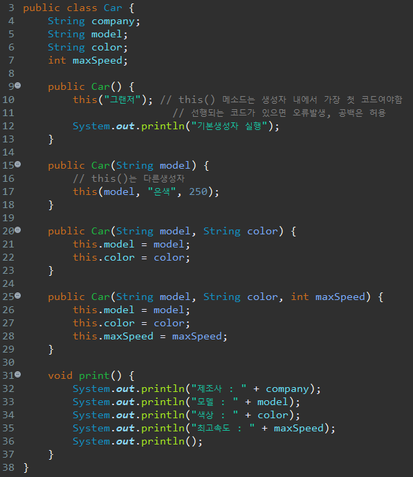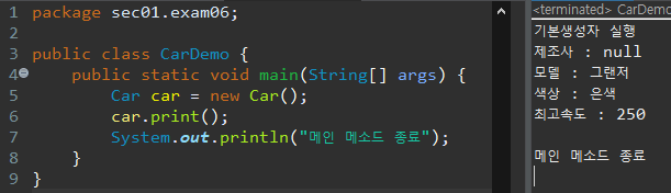 그러면 최종적으로 메인메소드에서 새로운 Car 객체를 생성하여 print 생성자를 호출해 출력해주면