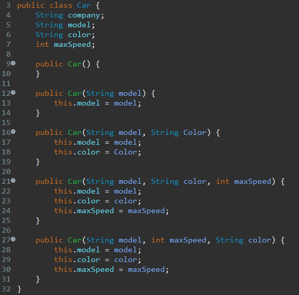 (Line 9는 기본생성자이고, 다른 생성자들은 매개변수를 가진 생성자들이다.)
