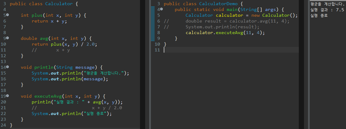 excuteAvg에서 print 메소드를 실행하여 println 메소드에서 실행문을 출력하고 다시 executeAvg로 돌아와 실행문을 출력한 다음 실행결과를 메인메소드로 보내주어 콘솔창에서 최종 출력 결과를 확인할 수 있다.