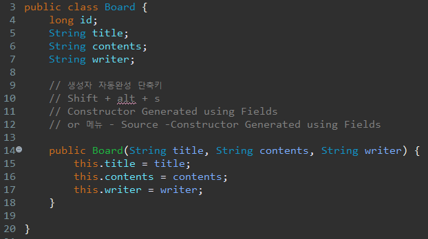 Shift + alt + s 단축키를 눌러 Constructor Generated using Fields를 활용하면