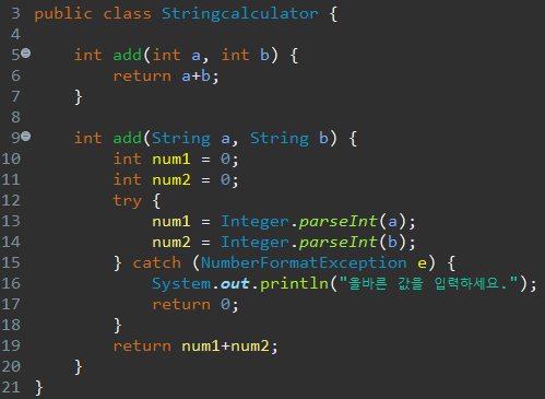 예외가 발생하는 것을 해결해주기 위해 try-catch문으로 NumberFormatException으로 예외처리를 해주어야한다.