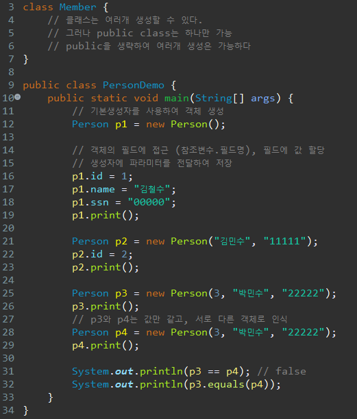 클래스, 필드, 생성자, 메소드의 개념과 특징을 요약한 내용은 코드 내 참조로 작성해두었다.