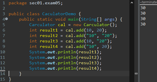 메소드 오버로딩2에서는 각 메소드의 이름을 add로 모두 동일하게 선언하였다.