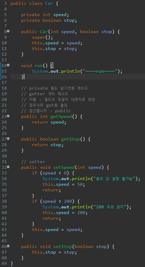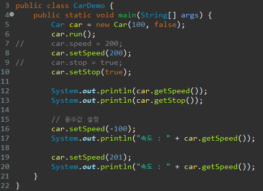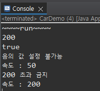CarDemo 클래스에서는 getter 메소드와 setter 메소드로 private 필드를 호출하여 정상적으로 실행되었고,
