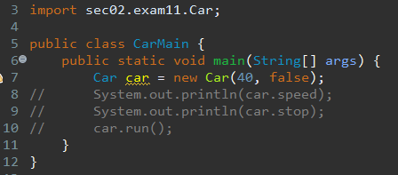 CarMain 클래스 에서는 private 필드를 직접 호출하여 컴파일 에러가 발생하는 것을 확인하였다.