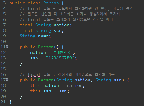 final 필드를 초기화 하는 방법은 필드를 선언할 때 초기화하는 방법과 생성자에서 초기화하는 방법 2가지이고,