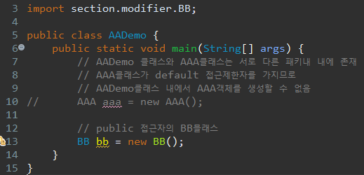 접근제한자 default로 설정된 클래스의 경우에는 동일한 패키지 내 외부 클래스에서는 인스턴스를 생성하여 사용할 수 있지만 서로 다른 패키지의 외부 클래스에서는 해당 클래스의 인스턴스를 생성하여 사용할 수 없다.
