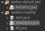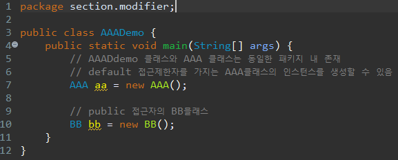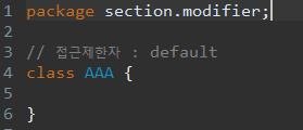 => 클래스, 멤버, 생성자, 메소드 모두 접근제한자를 생략했을 경우에는 default로 설정된다.
