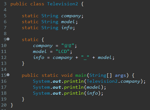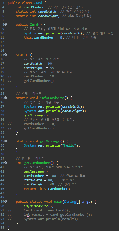 static 블록에는 반드시 static 필드와 메소드만 담을 수 있다는 점을 유의해야한다!