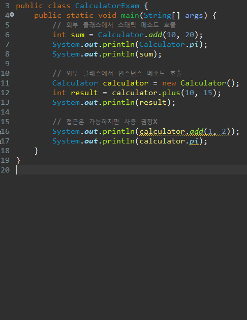 정적 메소드는 외부 클래스에서 '변수명.메소드명()'의 형태로도 활용은 가능하지만 권장하지는 않는다.