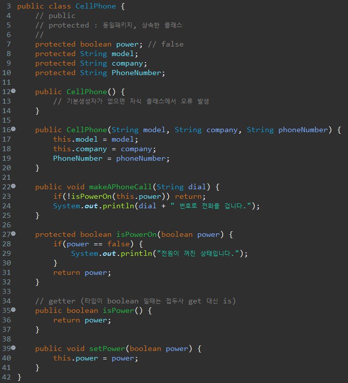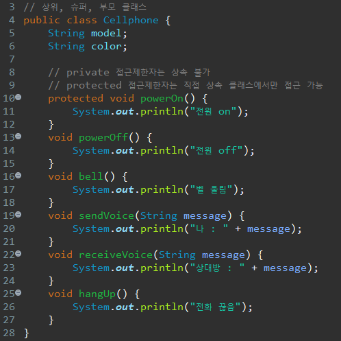 먼저 상위 클래스 Cellphone 을 생성하여 필드와 메소드를 선언해준다.