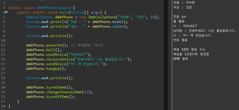 메인메소드 내에 DmbCellPhone(하위클래스) 객체를 새로 생성해주고, 동시에 초기화(값 할당)를 해준다.