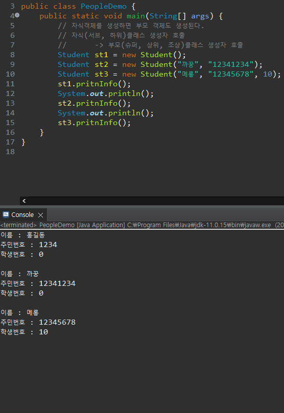 이처럼 하위 클래스의 객체를 새로 생성한 경우, 하위 클래스는 상위 클래스를 상속하고 있으므로