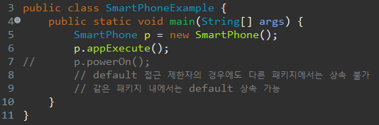 외부 클래스에 있고, Cellphone 클래스를 직접 상속하지 않는 SmartPhoneExample 클래스에서는 수행이 불가한 것이다.