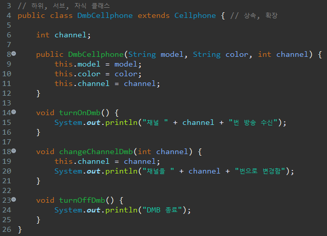 DmbCellphone 클래스는 Cellphone 클래스를 상속(확장, extends)하였기 때문에