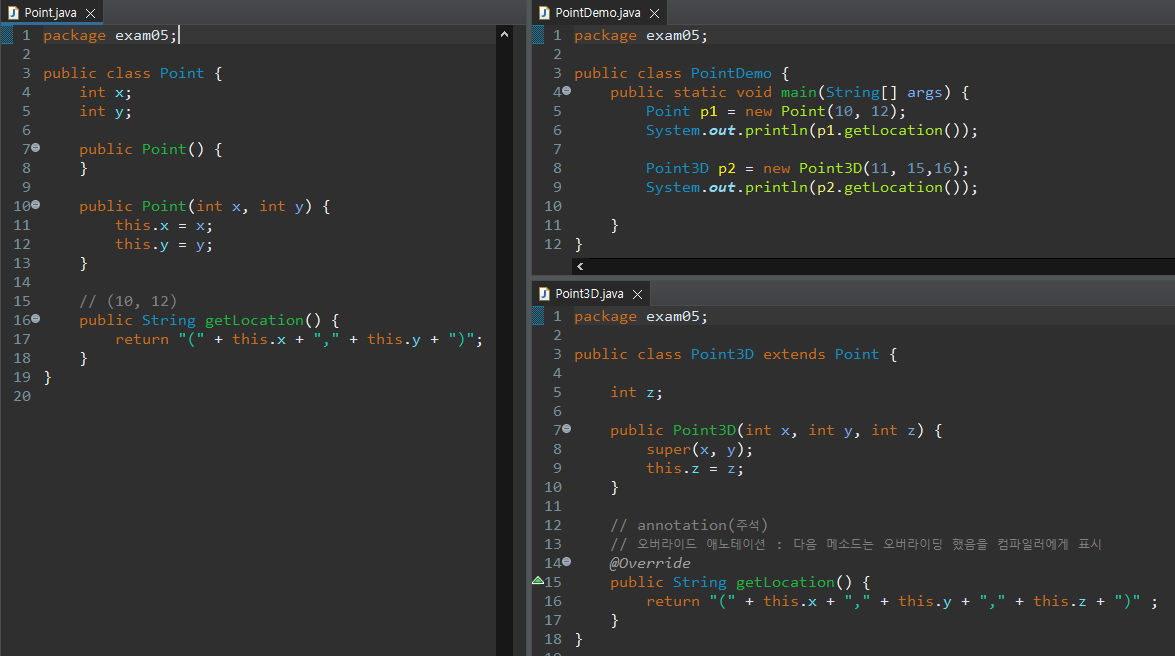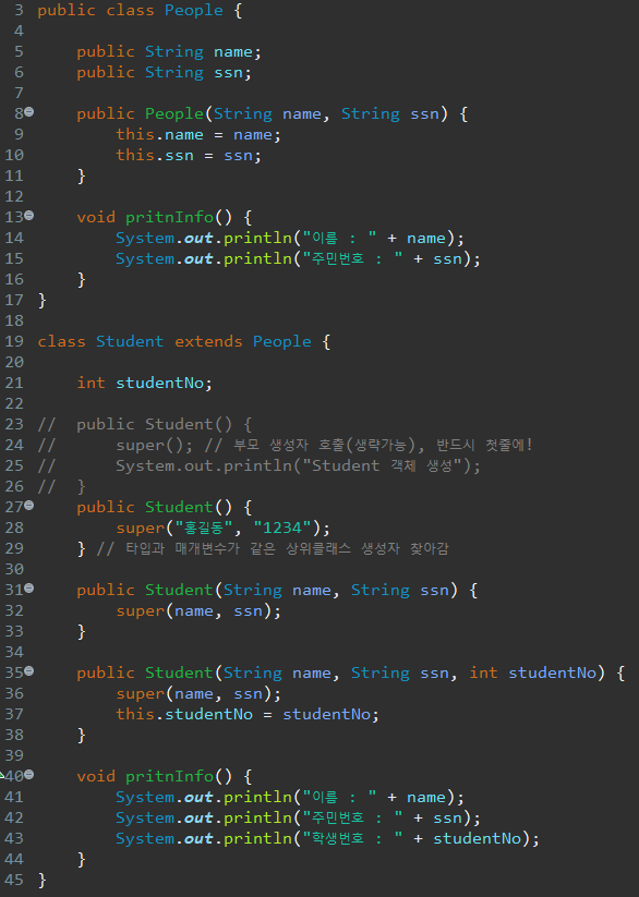 그리고 상위 클래스의 메소드(Line 11-16) 와 하위 클래스의 메소드(Line 20-22)를