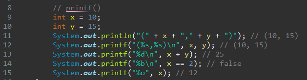%b : boolean 출력 / %o : 8진수 출력 / %x : 16진수 출력