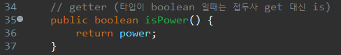 필드의 타입이 boolean일 경우에는 접두사 get 대신에 접두사 is를 사용한다는 것을 알아두어야한다 :)