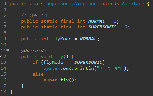 이때 하위 객체에서 상수와 flyMode를 정의해주고, 메인메소드에서 하위 객체를 새롭게 생성해주면