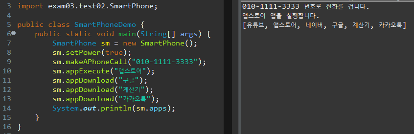 SmartPhoneExample 클래스의 메인메소드에서 Smartphone 객체를 생성한 다음