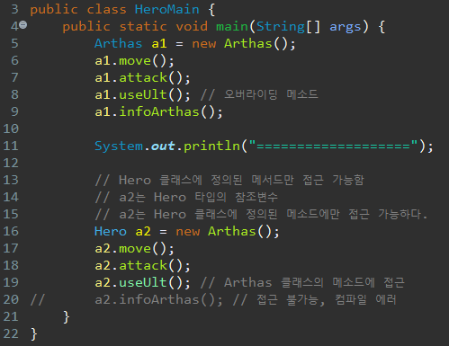 즉, Hero의 참조변수 a2는 Hero 클래스에 정의된 메소드에만 접근이 가능한 것이다.