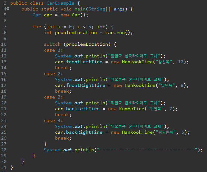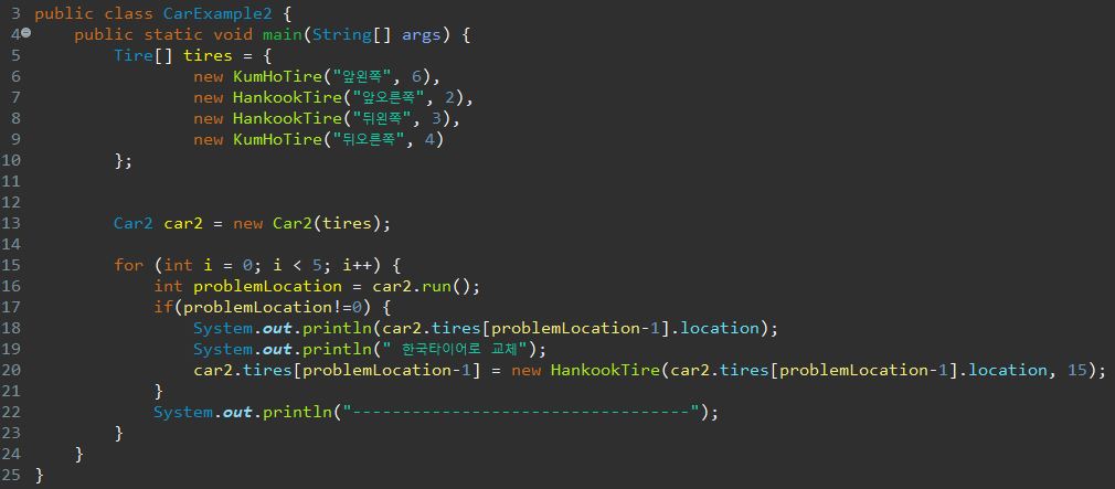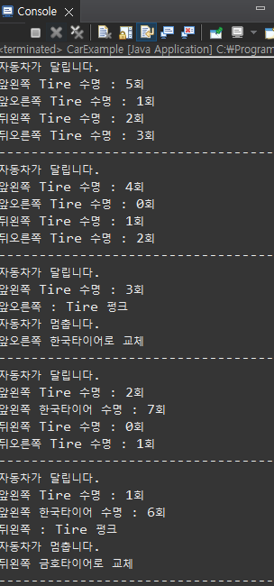 Car의 run() 메소드에서는 자동차가 달리기 시작하여 타이어에 펑크가 난 경우