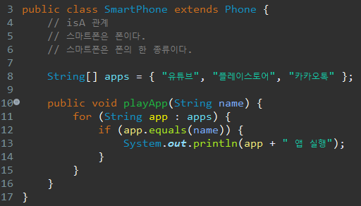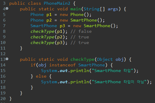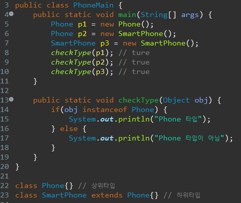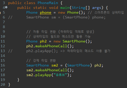마찬가지로 하위타입의 SmartPhone 객체는 자동 타입 변환을 통해 Phone 객체에 할당할 수 있고,