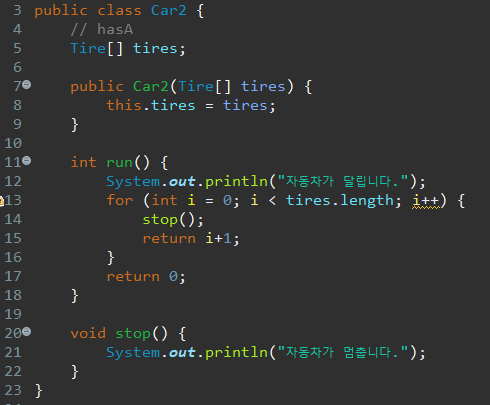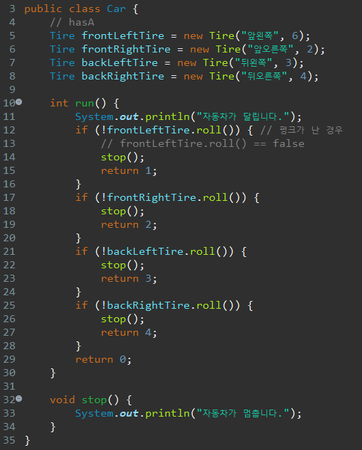 Car 클래스에서는 자동차의 타이어 4개를 필드로 정의하고, run(), stop() 메소드를 정의하였고,