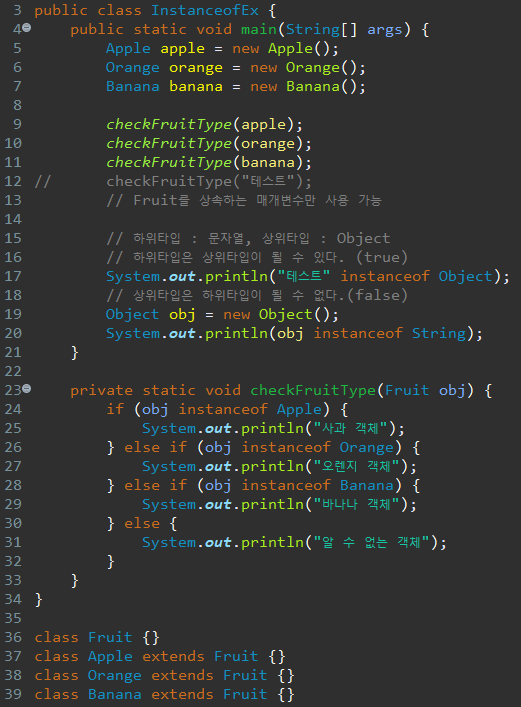 그리고 instanceof를 통해 객체의 타입을 출력하는 checkFruitType 메소드를 정의해주고,