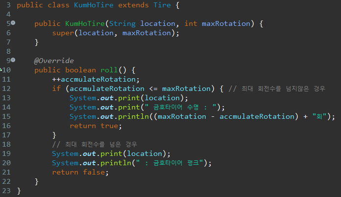 Tire 클래스에서는 타이어의 최대회전수, 누적회전수, 타이어위치와 roll() 메소드를 정의하였다.