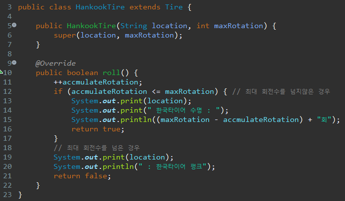 다음으로 Tire 클래스를 상속하는 HankookTire 와 KumhoTire 클래스를 생성한다.