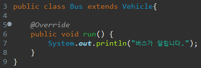 Vehicle 클래스를 상속하는 Bus와 Taxi 클래스를 각각 생성하여 run() 메소드를 오버라이딩 해주었다.