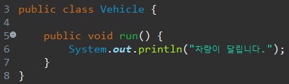 먼저 Vehicle 클래스에 run 메소드를 정의하고, 생성자 호출을 위한 Driver 클래스를 생성한 다음