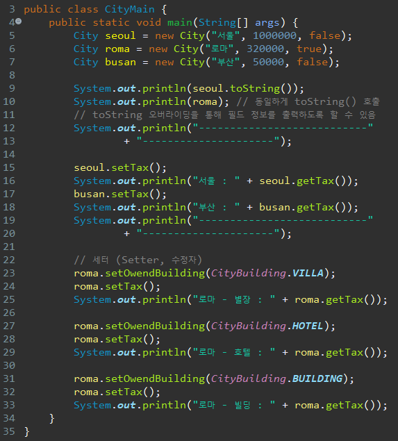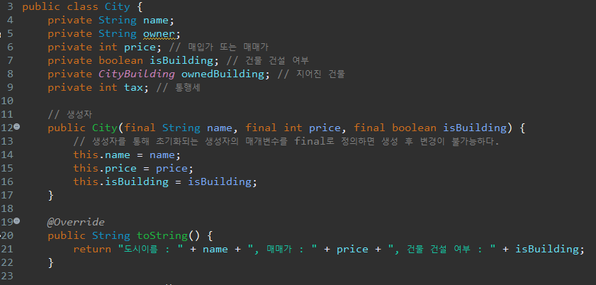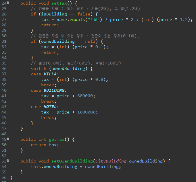 그리고 setter에 건설된 건물을 전달하고, 매입가를 계산해주도록 호출해주고,