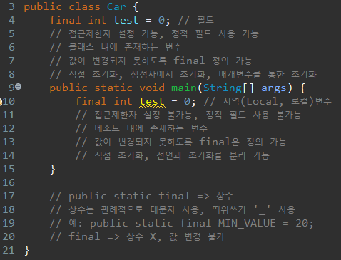 필드는 접근제한자 설정과 정적 필드 사용이 가능하고, 외부에서 값이 변경되지 못하도록 final 정의도 가능하다.