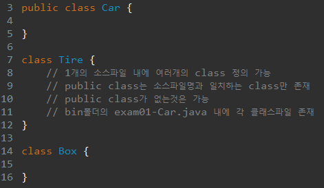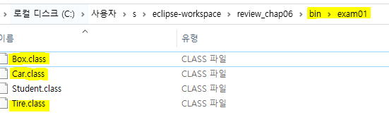 위의 코드에서 클래스들이 저장된 exam01-Car.java 파일은