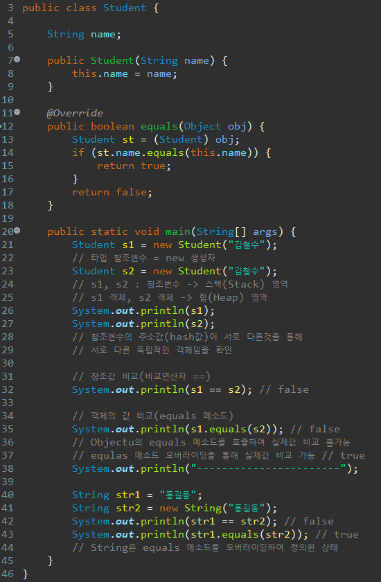 그리고 객체의 실제값을 비교하기 위해서는 오버라이딩하여 재정의한 equals 메소드를 활용하여