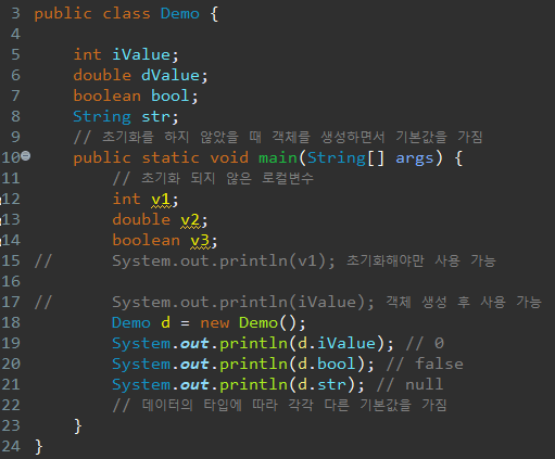 예를 들어, int타입은 0, double 타입은 0.0, boolean 타입은 false, String 타입은 null 값이 할당된다.