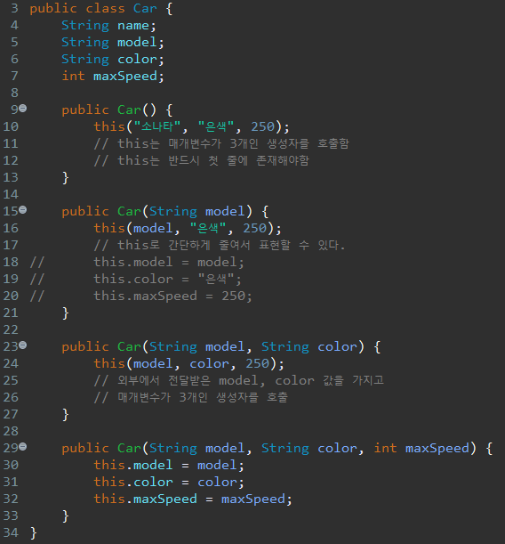 this 메소드는 생성자 내 가장 첫 줄에 위치해야하며, 위의 코드에서 호출되는 this는 Car 클래스이다.