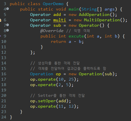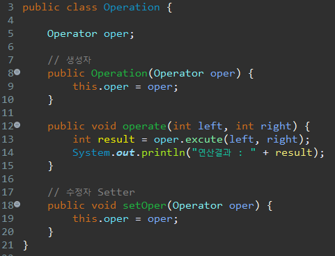 Line 21에서는 Operation 클래스의 Setter로 add가 전달되고, this.oper에 add가 할당된다.