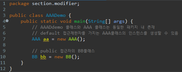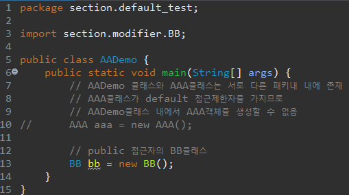 위의 public 접근제한자 BB 클래스와 default 접근제한자 AAA 클래스에 접근이 가능한지 확인해보았다.