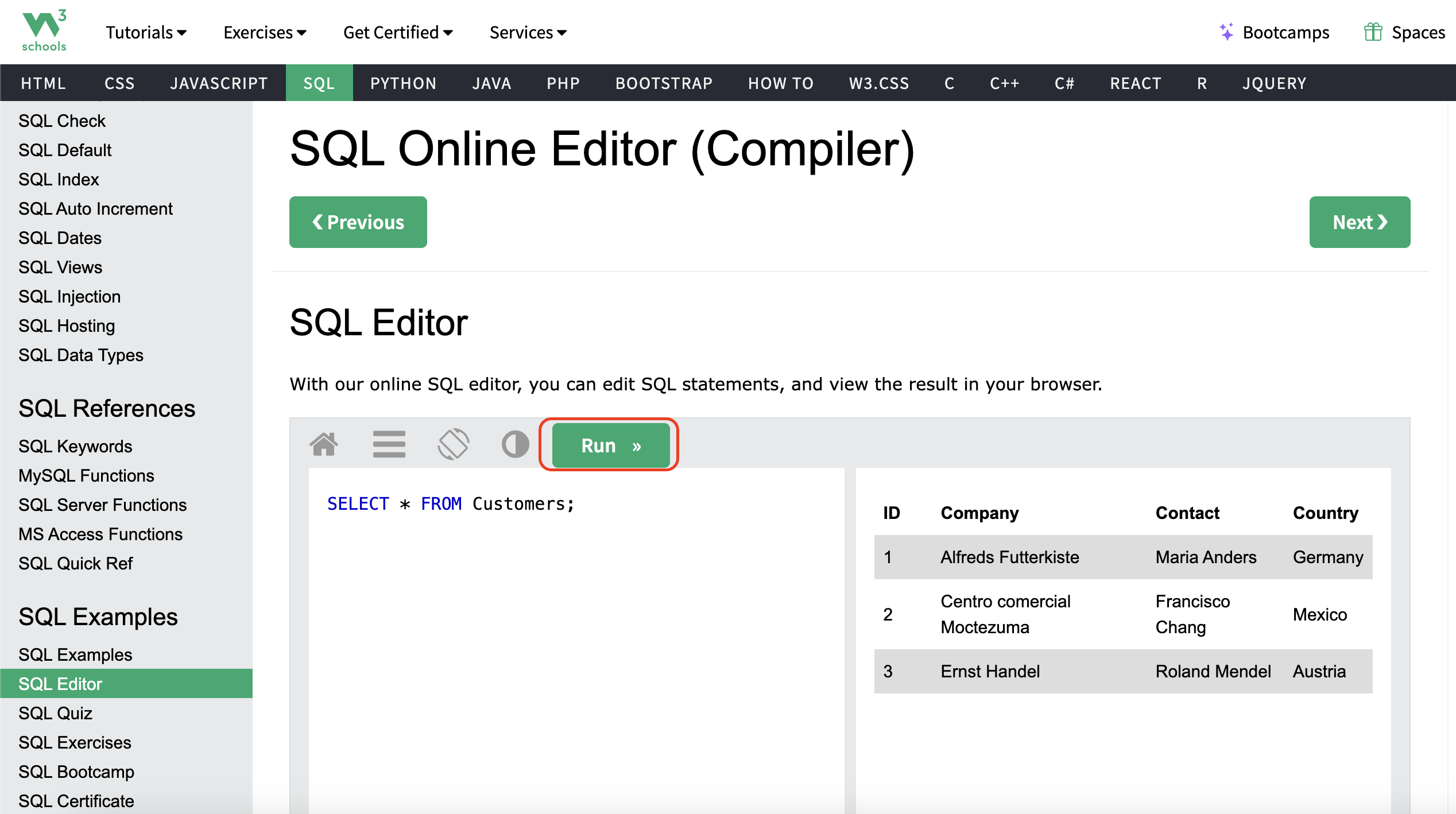 w3schools 에서는 SQL 이외에도 다양한 언어 정보를 얻을 수 있고,