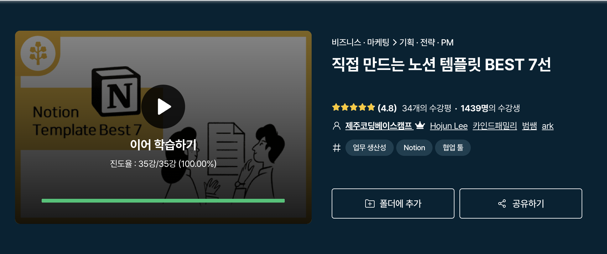 ⌜직접 만드는 노션 템플릿 BEST 7선⌟ 강의 소개 및 수강 후기를 남겨보려해요!
