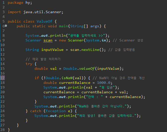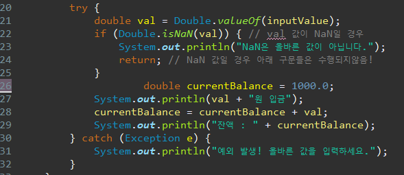 try문 내에 if문을 활용하여 NaN이 아닐 경우(int 타입의 입력값일 경우) 잔액을 계산하고,